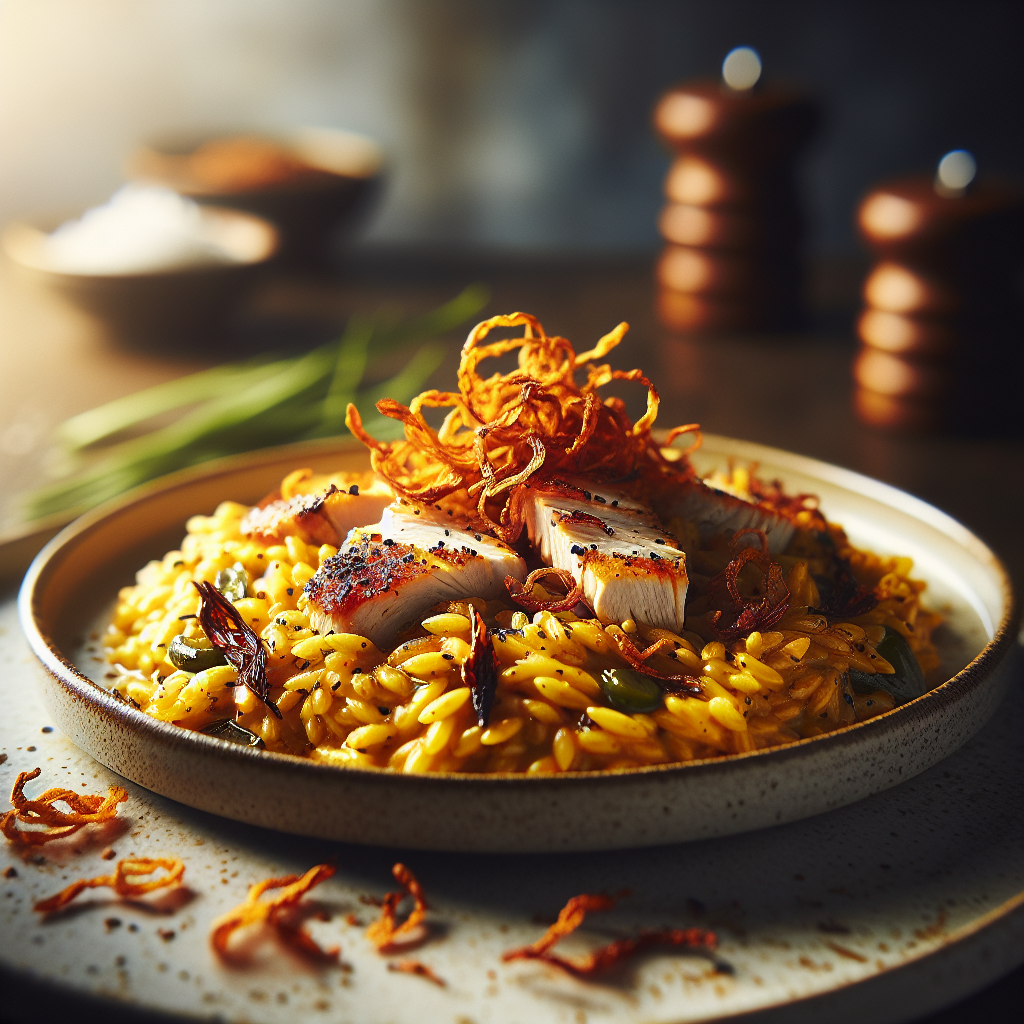 Saffron & Chicken Orzotto with Crispy Shallots