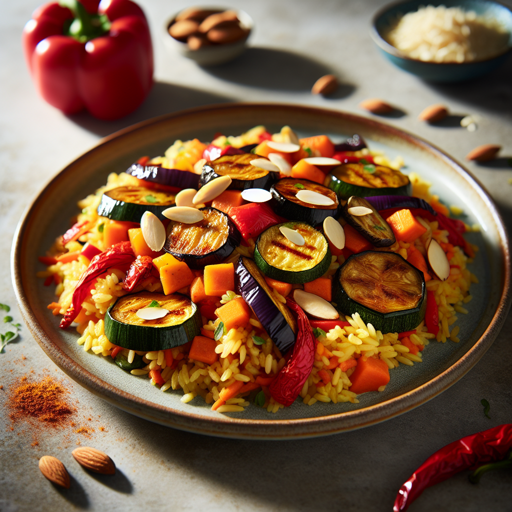 Saffron-Kissed Rice Pilaf with Roasted Vegetables and Toasted Almonds
